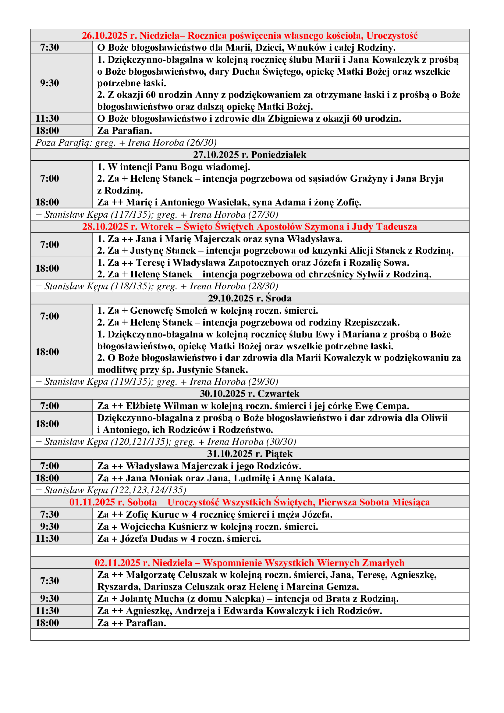Intencje Mszalne 26.10-02.11. 2025 r.
