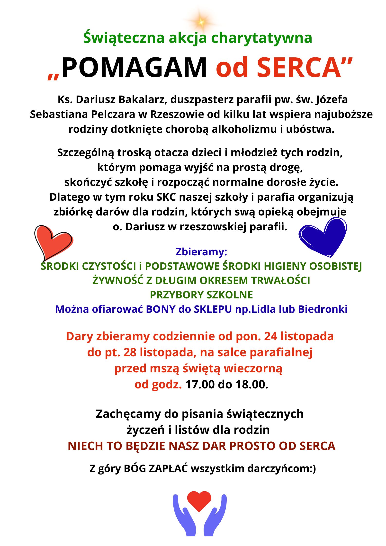 Szczególną troską otacza dzieci i młodzież tych rodzin, którym pomaga wyjść na prostą drogę, skończyć szkołę i rozpocząć normalne dorosłe życie. Dlatego SKC naszej szkoły i parafia organizują w tym przedświątecznym czasie zbiórkę darów dla rodzin, których swą opieką obejmuje o. Dariusz i osoby go wspierające w rzeszowskiej parafii.