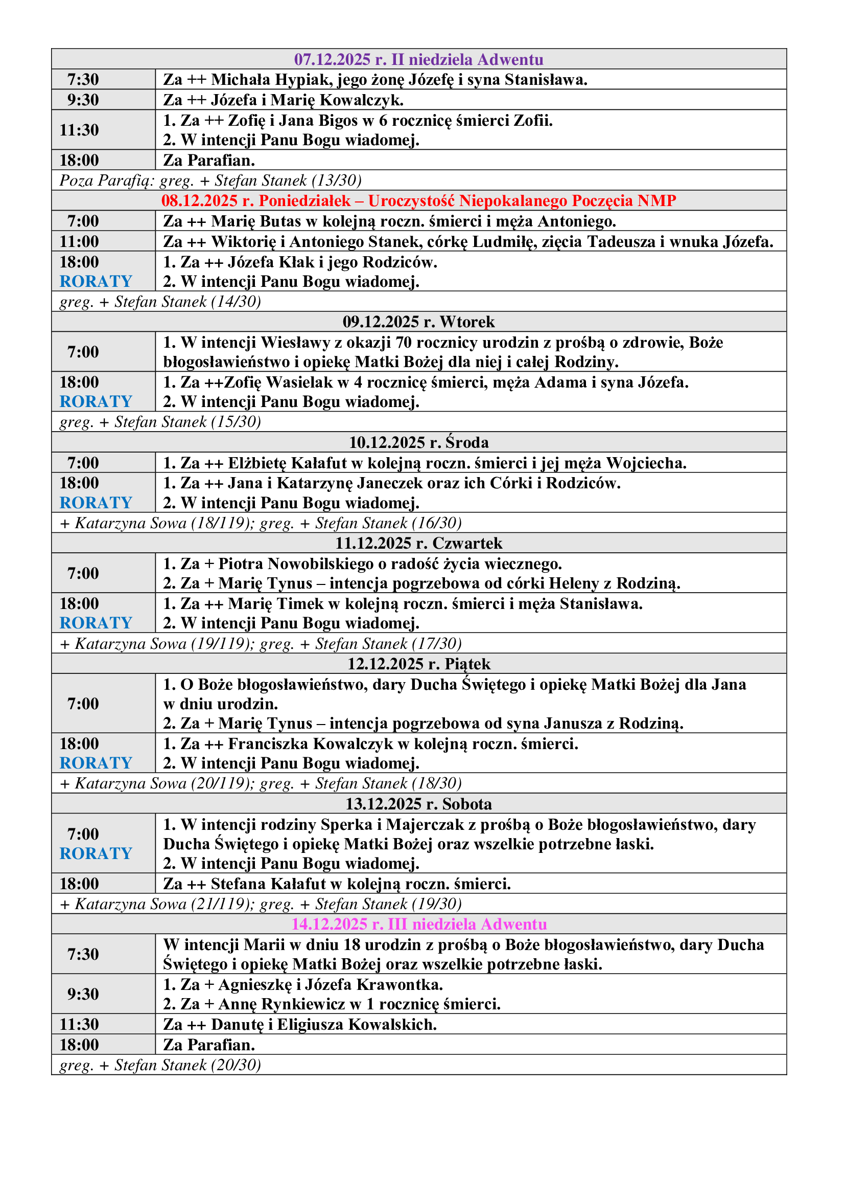 Intencje mszalne od 07 do 14 grudnia 2025 r.