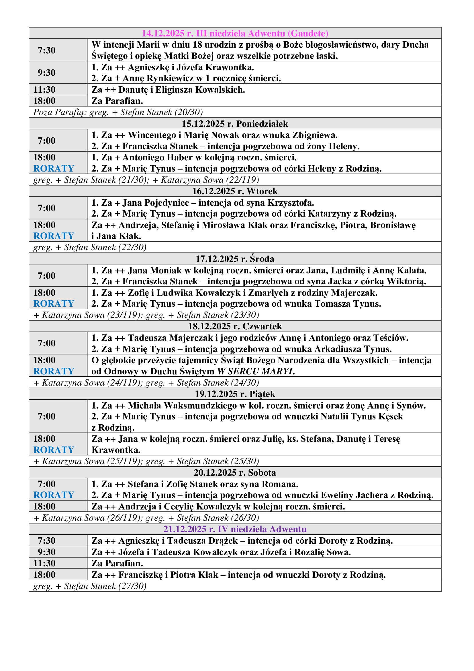 Intencje mszalne od 14-21.12.2025 r.