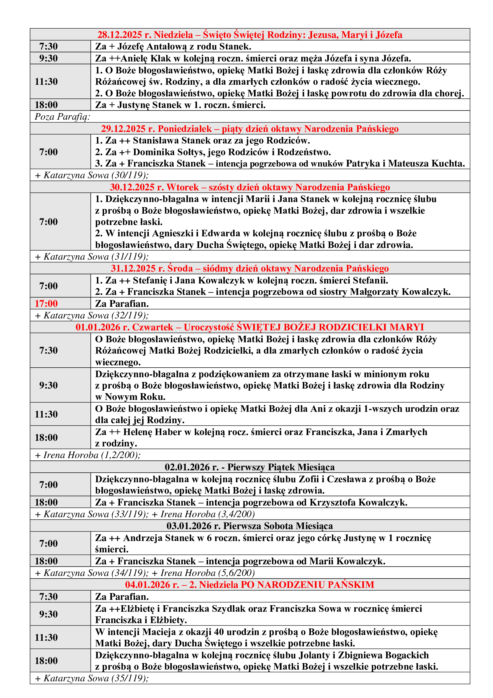 Intencje mszalne 28.12.2025r.-04.01.2026 r.