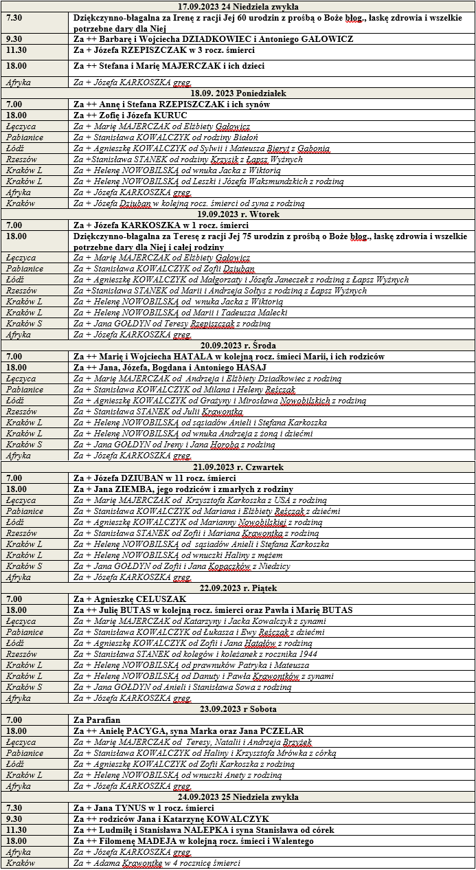 Intencje Mszy świętej od 17 do 24 września 2023 r.
