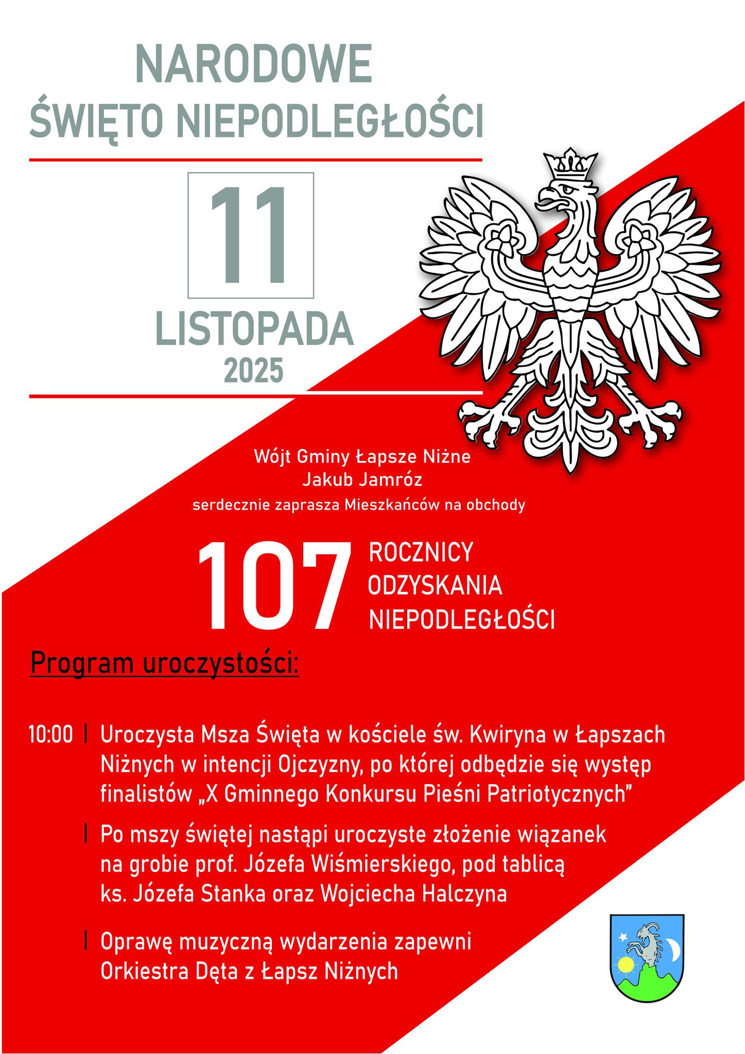 Wójt Gminy Łapsze Niżne Jakub Jamróz serdecznie zaprasza wszystkich Mieszkańców do wspólnego świętowania 107. rocznicy odzyskania przez Polskę niepodległości!