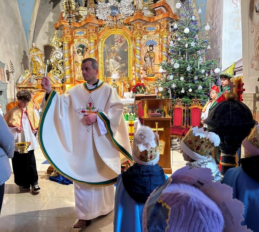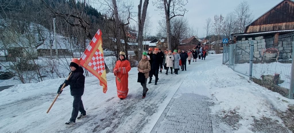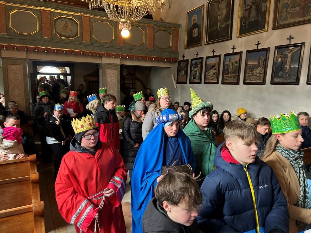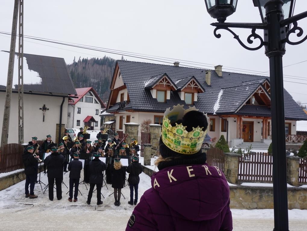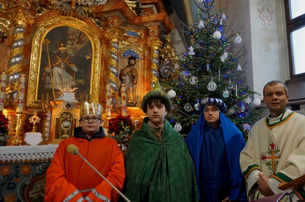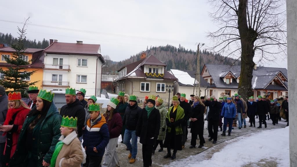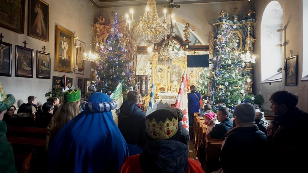 Wszyscy spotkali się przy kościele, a złączywszy swe siły i z radością śpiewając kolędę „Bóg się rodzi” przy akompaniamencie naszej łapszańskiej orkiestry przeszli tanecznym krokiem wokół kościoła aby uroczyście wejść do niego i pokłonić się Świętej Rodzinie. W świątyni w oczekiwaniu na Mszę Św. kolędowanie zaintonowała schola, która towarzyszyła orszakowi niebieskiemu. Uroczysta Msza Święta była ukoronowaniem naszego parafialnego wydarzenia - to jedyna taka Msza Św. gdzie na głowach wiernych zobaczyć można kolorowe korony. I nawet sam ks. Proboszcz stał przy ołtarzu z koroną na głowie. Królowie czytali czytania, schola śpiewała psalm, przygrywała orkiestra, a wszyscy kolędując cieszyli tym pięknym dniem. Ks. Dariusz Jabłoński w głoszonym kazaniu mówił o tym czego uczą nas Trzej Królowie i o tym, co znaczą dary składane przez nich. I tak: złoto oznacza królewską godność Dzieciątka Jezus, kadzidło symbolizuje jego boskość, a mirra zapowiada jego cierpienie. Ważne aby w swoim życiu człowiek zawsze podążał za gwiazdą Trzech Mędrców tak aby nigdy nie być tak zajętym sobą aby nie przeoczyć spotkania z Jezusem. Litery pisane kredą na drzwiach naszych domów: C+M+B symbolizują nie tylko pierwsze litery imion Mędrców, ale przede wszystkim nawiązują do łacińskiej sentencji: „Christus mansionem benedicat’ – „Niech Chrystus błogosławi ten dom.” To błogosławieństwo ma nas umacniać na każdym kroku naszego codziennego życia. To był piękny dzień.