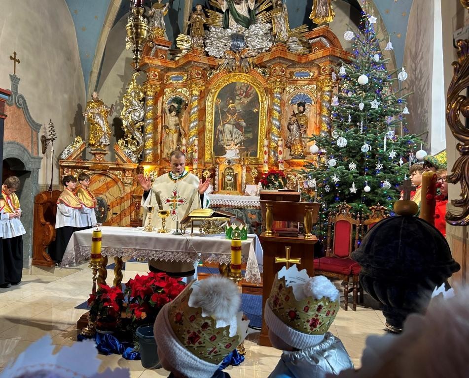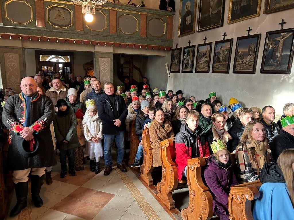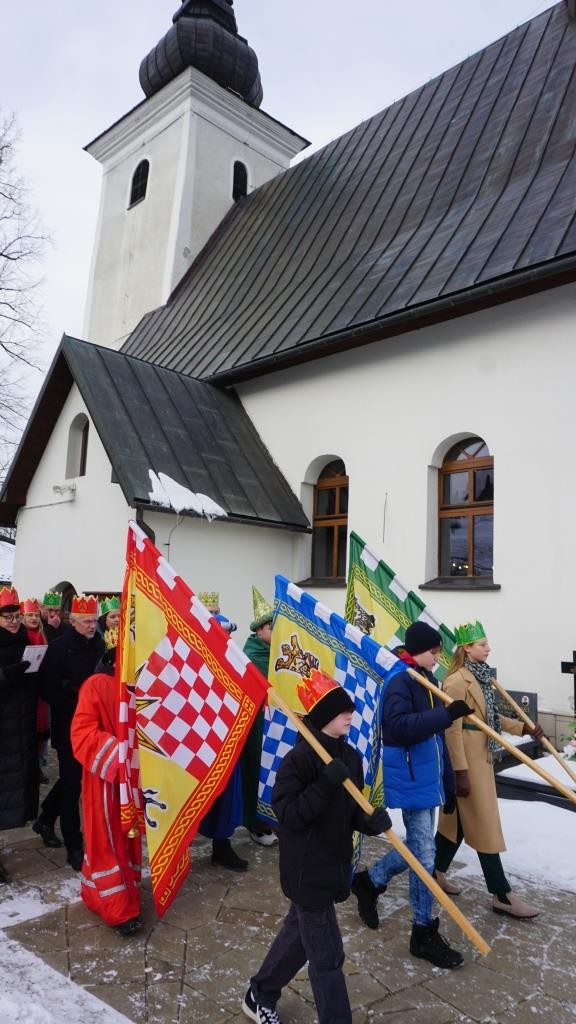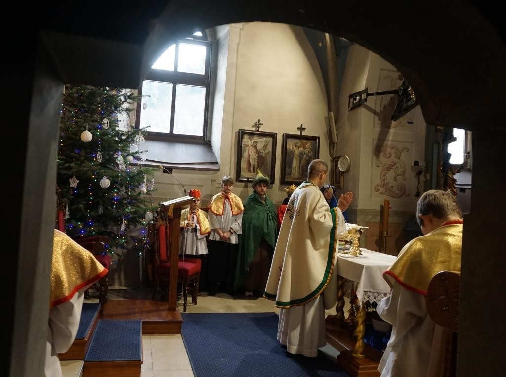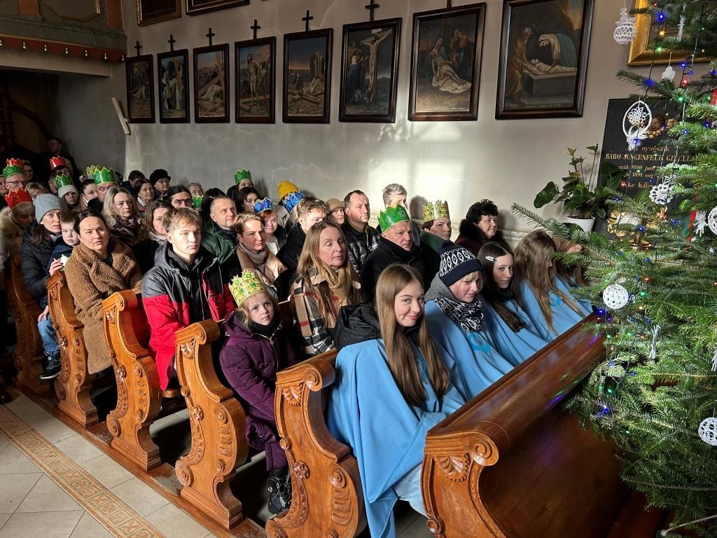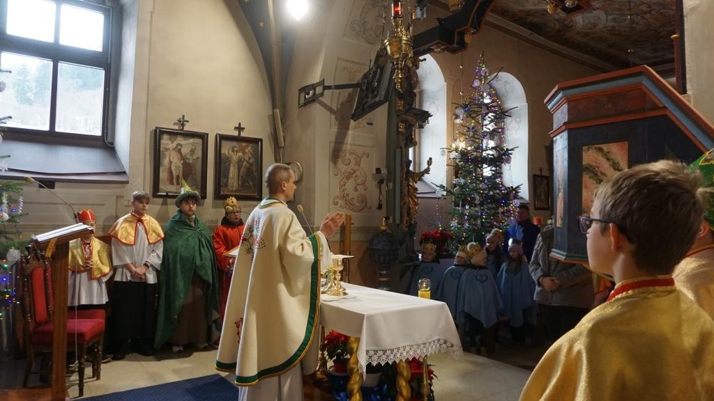 Wszyscy spotkali się przy kościele, a złączywszy swe siły i z radością śpiewając kolędę „Bóg się rodzi” przy akompaniamencie naszej łapszańskiej orkiestry przeszli tanecznym krokiem wokół kościoła aby uroczyście wejść do niego i pokłonić się Świętej Rodzinie. W świątyni w oczekiwaniu na Mszę Św. kolędowanie zaintonowała schola, która towarzyszyła orszakowi niebieskiemu. Uroczysta Msza Święta była ukoronowaniem naszego parafialnego wydarzenia - to jedyna taka Msza Św. gdzie na głowach wiernych zobaczyć można kolorowe korony. I nawet sam ks. Proboszcz stał przy ołtarzu z koroną na głowie. Królowie czytali czytania, schola śpiewała psalm, przygrywała orkiestra, a wszyscy kolędując cieszyli tym pięknym dniem. Ks. Dariusz Jabłoński w głoszonym kazaniu mówił o tym czego uczą nas Trzej Królowie i o tym, co znaczą dary składane przez nich. I tak: złoto oznacza królewską godność Dzieciątka Jezus, kadzidło symbolizuje jego boskość, a mirra zapowiada jego cierpienie. Ważne aby w swoim życiu człowiek zawsze podążał za gwiazdą Trzech Mędrców tak aby nigdy nie być tak zajętym sobą aby nie przeoczyć spotkania z Jezusem. Litery pisane kredą na drzwiach naszych domów: C+M+B symbolizują nie tylko pierwsze litery imion Mędrców, ale przede wszystkim nawiązują do łacińskiej sentencji: „Christus mansionem benedicat’ – „Niech Chrystus błogosławi ten dom.” To błogosławieństwo ma nas umacniać na każdym kroku naszego codziennego życia. To był piękny dzień.