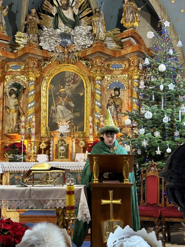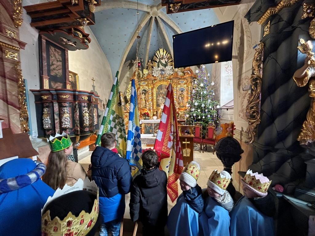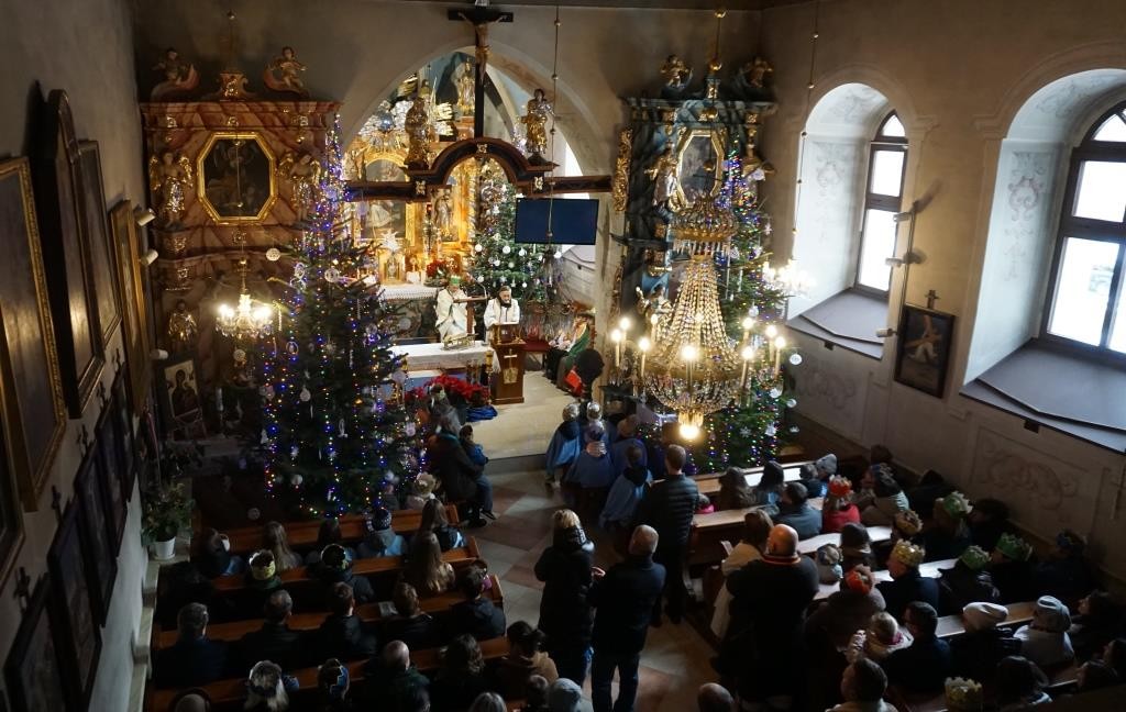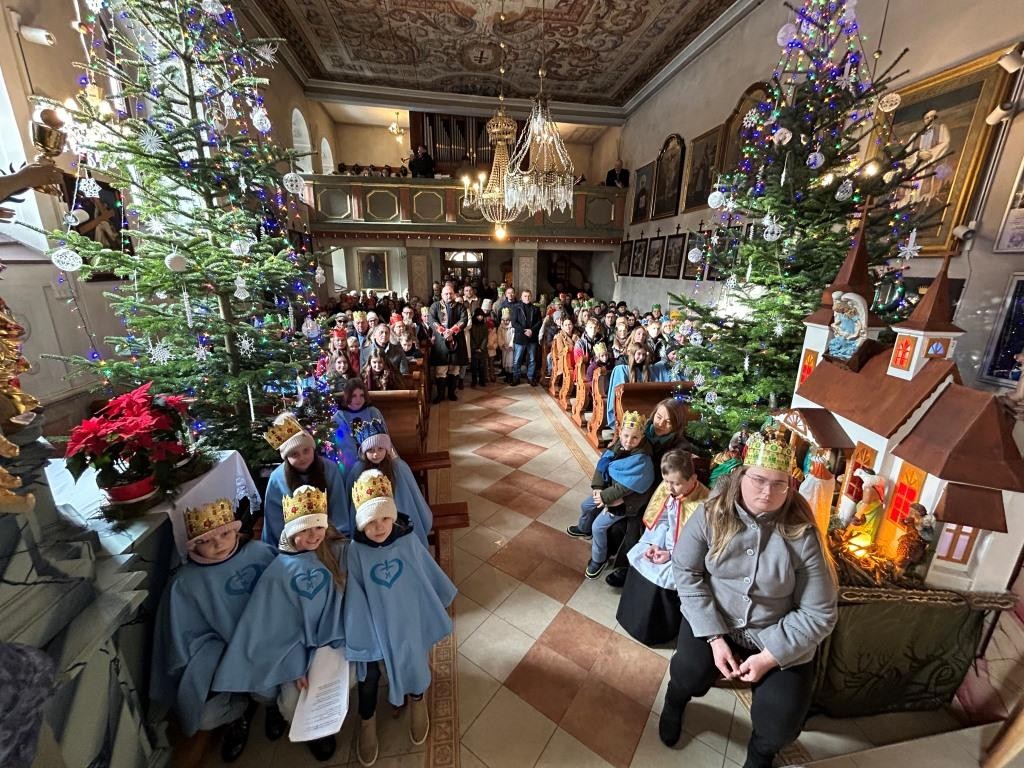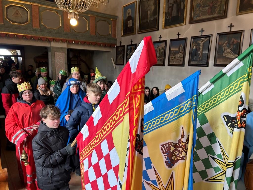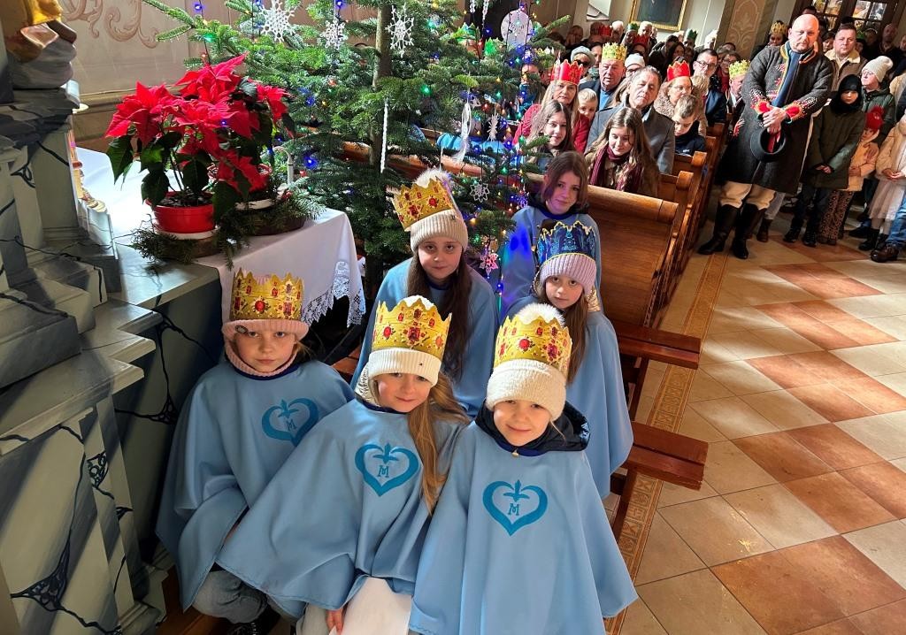 Wszyscy spotkali się przy kościele, a złączywszy swe siły i z radością śpiewając kolędę „Bóg się rodzi” przy akompaniamencie naszej łapszańskiej orkiestry przeszli tanecznym krokiem wokół kościoła aby uroczyście wejść do niego i pokłonić się Świętej Rodzinie. W świątyni w oczekiwaniu na Mszę Św. kolędowanie zaintonowała schola, która towarzyszyła orszakowi niebieskiemu. Uroczysta Msza Święta była ukoronowaniem naszego parafialnego wydarzenia - to jedyna taka Msza Św. gdzie na głowach wiernych zobaczyć można kolorowe korony. I nawet sam ks. Proboszcz stał przy ołtarzu z koroną na głowie. Królowie czytali czytania, schola śpiewała psalm, przygrywała orkiestra, a wszyscy kolędując cieszyli tym pięknym dniem. Ks. Dariusz Jabłoński w głoszonym kazaniu mówił o tym czego uczą nas Trzej Królowie i o tym, co znaczą dary składane przez nich. I tak: złoto oznacza królewską godność Dzieciątka Jezus, kadzidło symbolizuje jego boskość, a mirra zapowiada jego cierpienie. Ważne aby w swoim życiu człowiek zawsze podążał za gwiazdą Trzech Mędrców tak aby nigdy nie być tak zajętym sobą aby nie przeoczyć spotkania z Jezusem. Litery pisane kredą na drzwiach naszych domów: C+M+B symbolizują nie tylko pierwsze litery imion Mędrców, ale przede wszystkim nawiązują do łacińskiej sentencji: „Christus mansionem benedicat’ – „Niech Chrystus błogosławi ten dom.” To błogosławieństwo ma nas umacniać na każdym kroku naszego codziennego życia. To był piękny dzień.