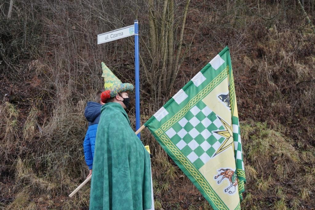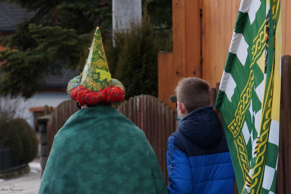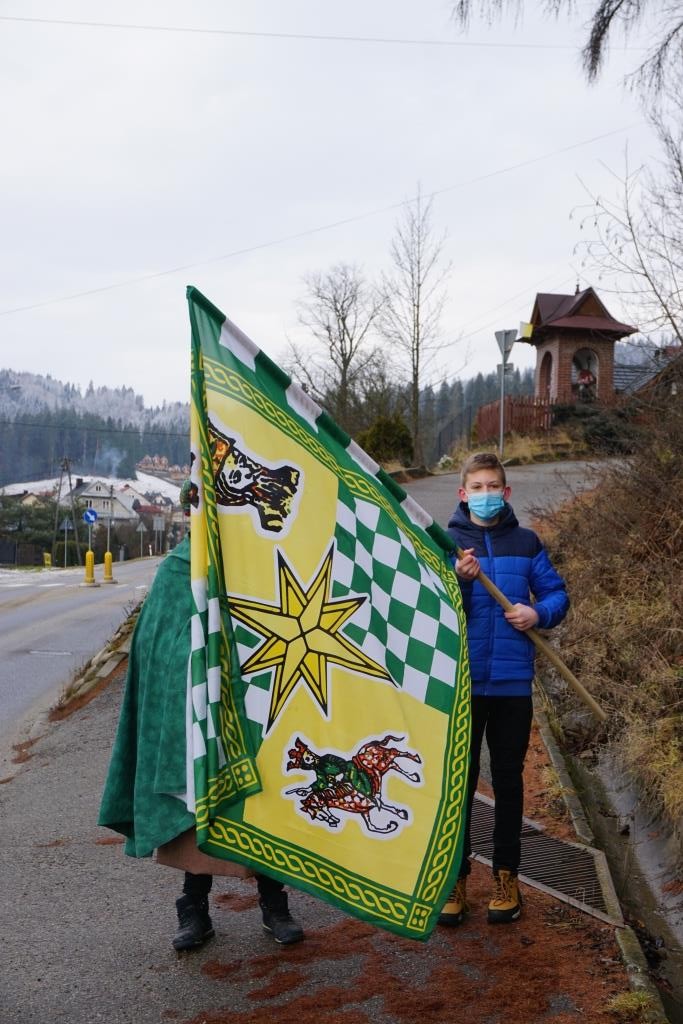 Osoby niosące flagi orszakowe i głośniki - Kowalczyk Patryk, Dziuban Angelika, Sowa Maria, Stanek Michał i Stanek Mikołaj.