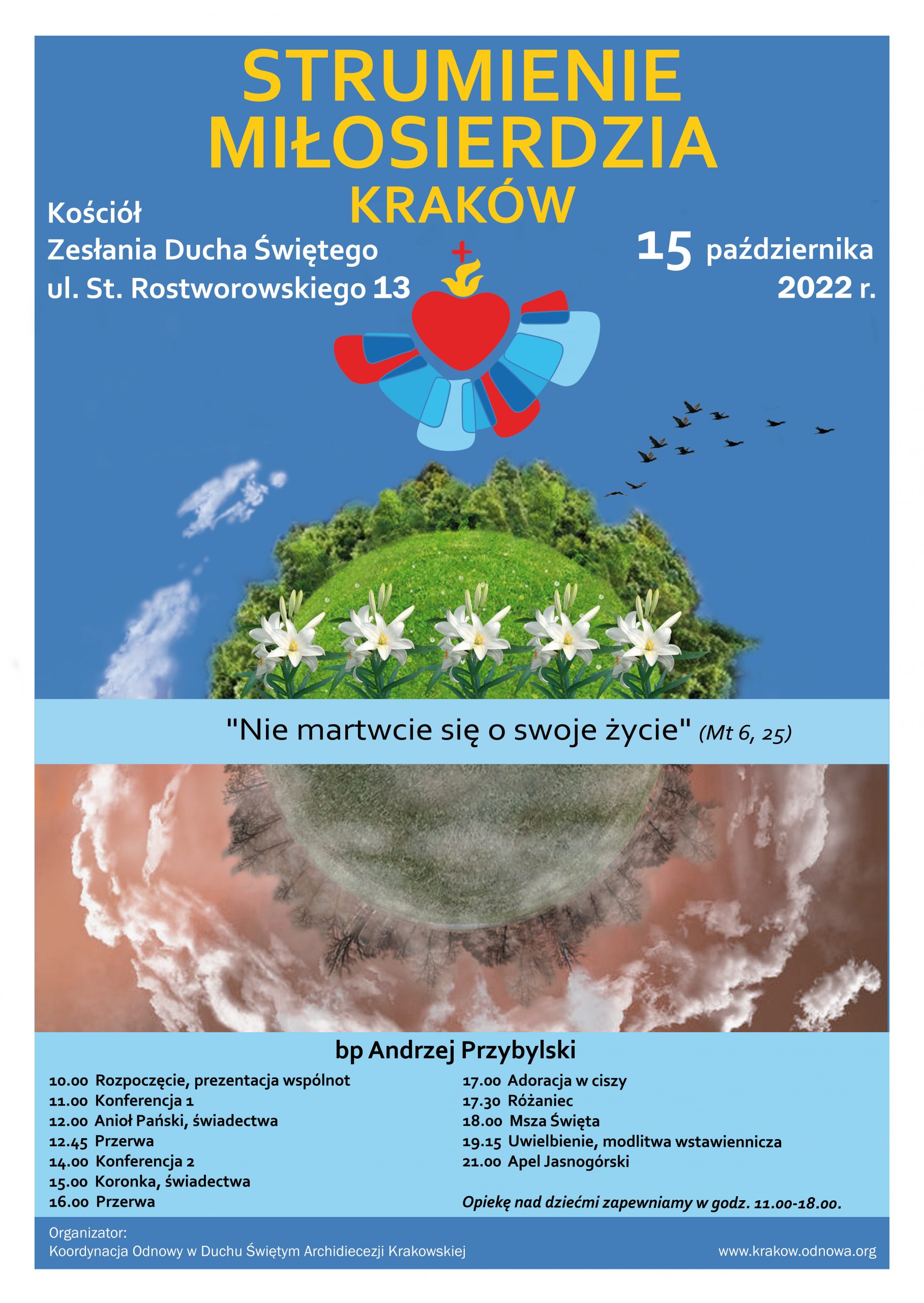 Strumienie Miłosierdzia 2022 odbywają się w dniu 15 października w kościele pw. Zesłania Ducha Świętego w Krakowie-Ruczaju (ul. Stanisława Rostworowskiego 13). W tym roku konferencje głosił będzie bp Andrzej Przybylski, delegat KEP ds. Ruchu Odnowy w Duchu Świętym.