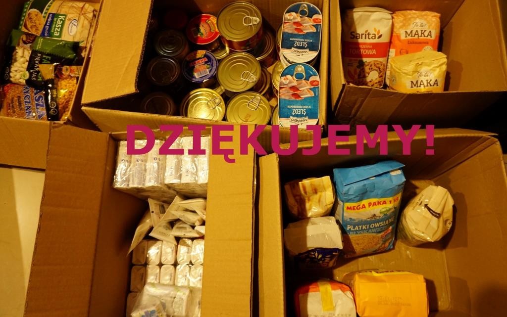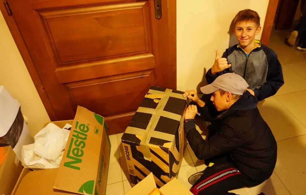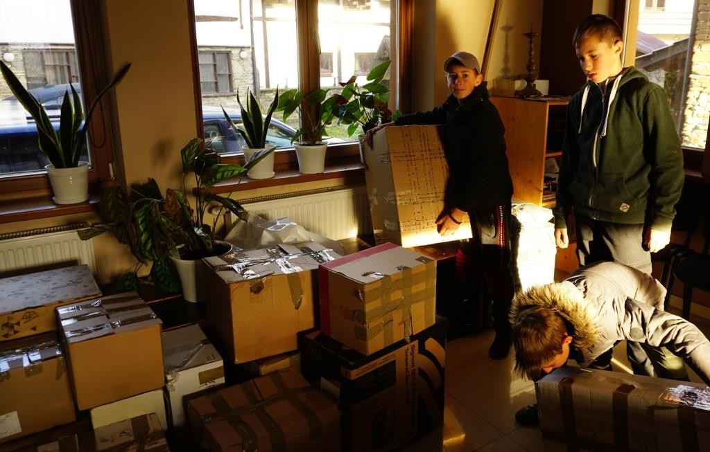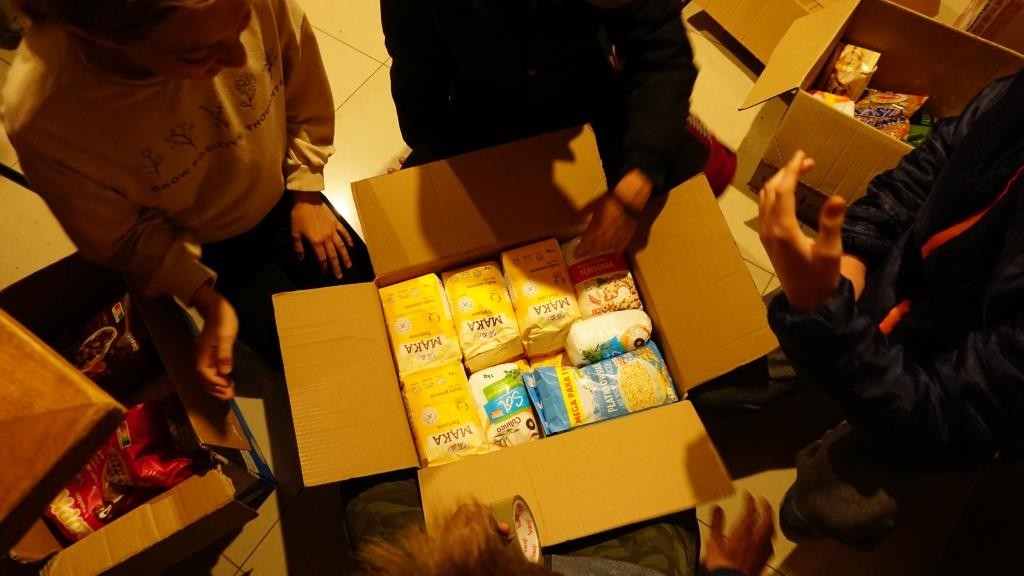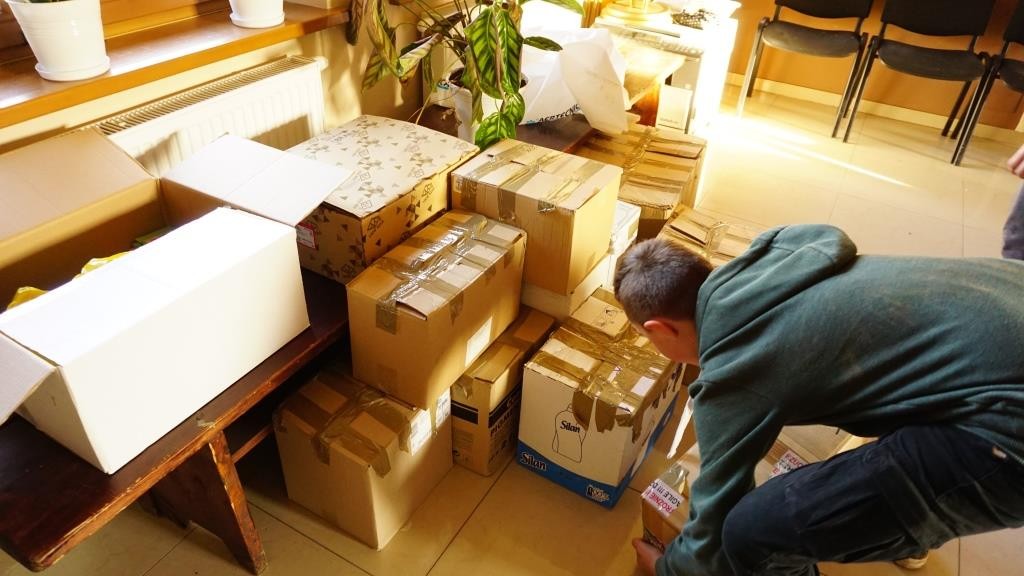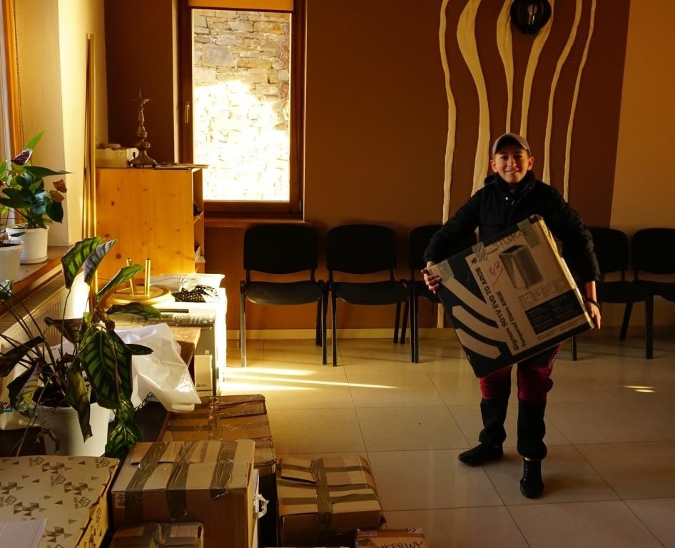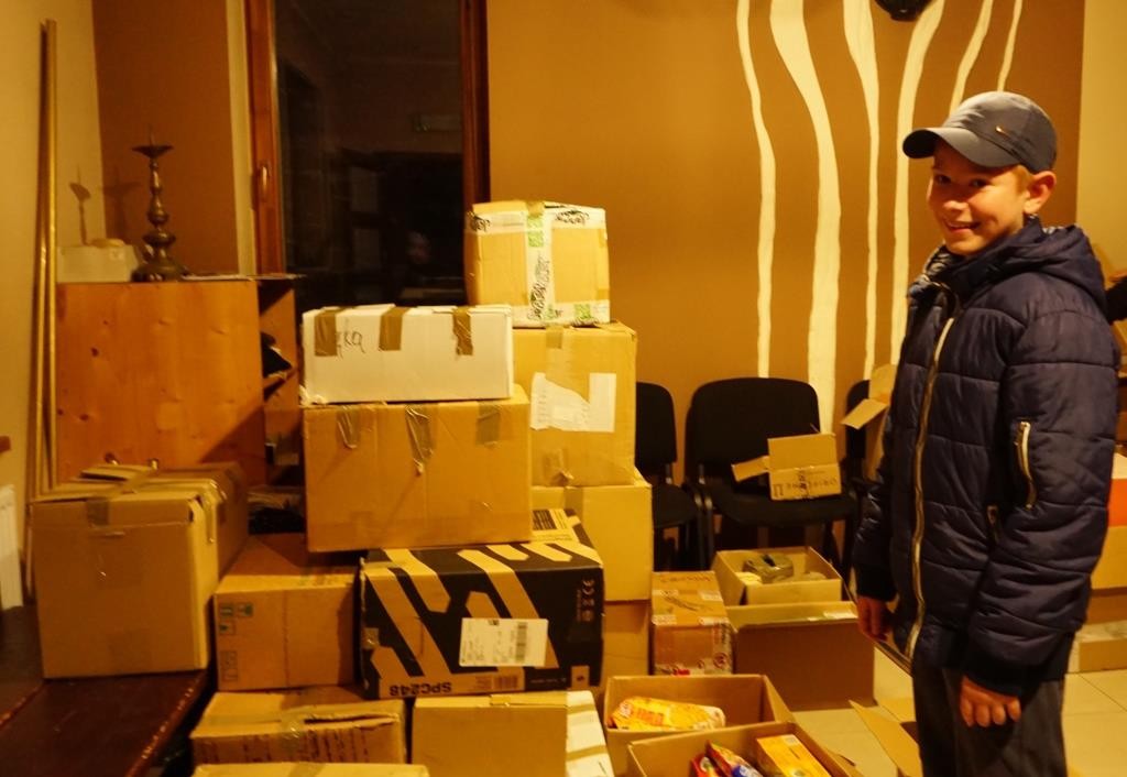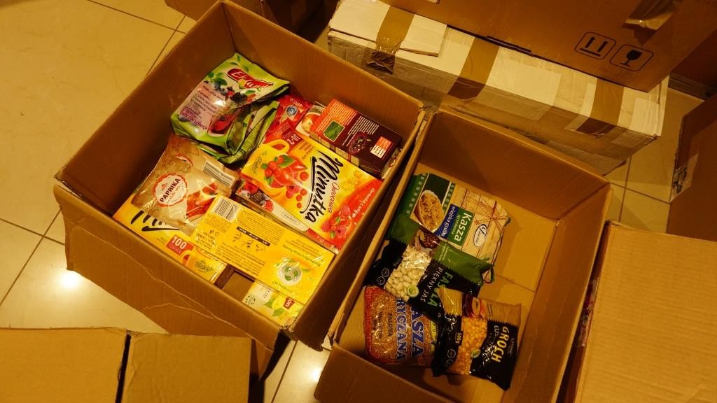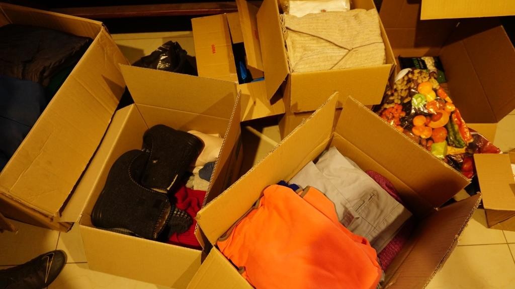 W kartonowych pudełkach spakowano m.in. słodycze, mąkę, ryż, makarony, konserwy, olej, słodycze, zeszyty, proszki do prania, mydła i w tym roku wyjątkowo m.in. zimowe kurtki, ciepłe swetry i spodnie.