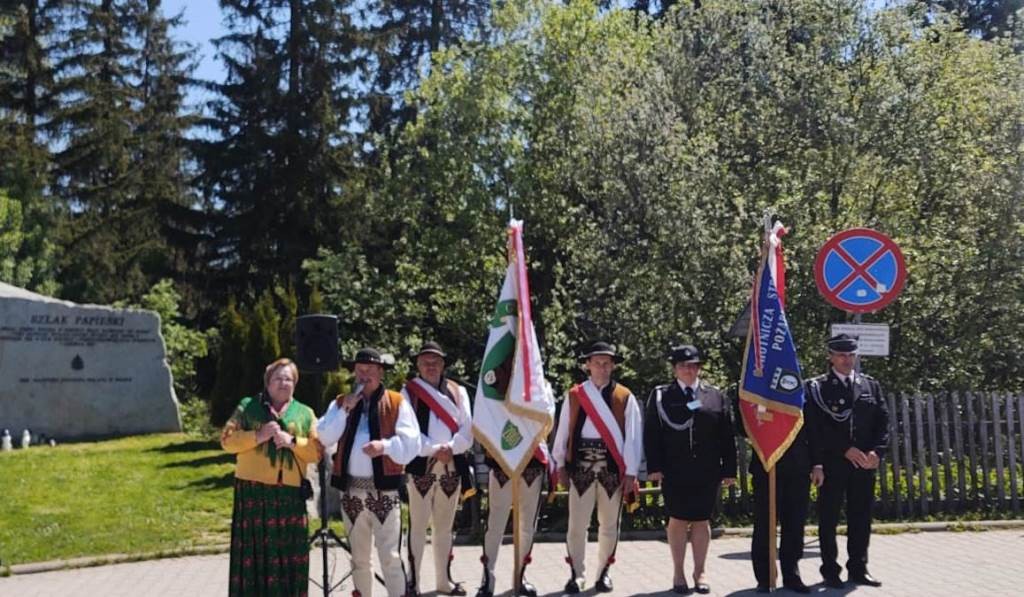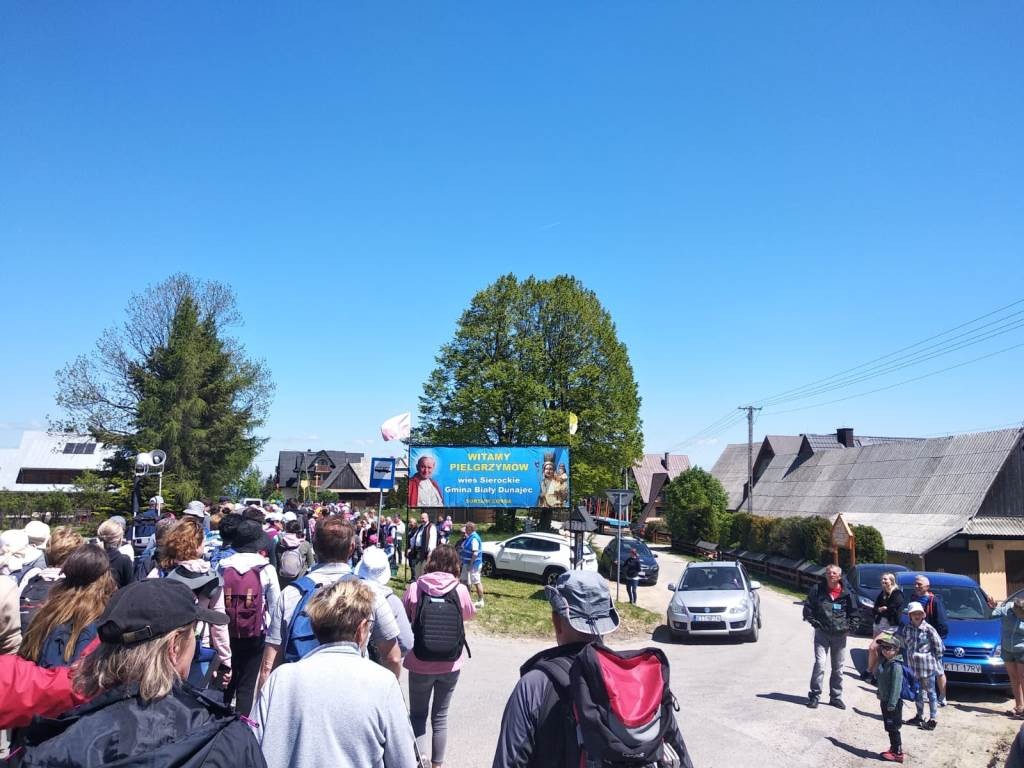 Z naszej parafii było to kilkanaście osób, podobnie jak z sąsiednich wsi, ale byliśmy tam. Jak co roku cała pielgrzymka szła w czterech grupach: orawskiej, nowotarskiej, zakopiańskiej i ludźmierskiej, szlakiem którym kiedyś przejeżdżał św. Jan Paweł II. Słowami przewodnimi w tym roku były słowa: „Wznoszę swe oczy ku górom”. Tak, nie sposób iść tą drogą i nie patrzeć na góry, raz, że piękno ich nieopisane, a dwa, czasem dokucza zmęczenie i spogląda się z nadzieją w górę … czy daleko jeszcze. Ale to dobry trud ok. 40 km drogi i ok. 50 tys. kroków. Droga szybko mija, a w tym roku pogoda była wymarzona, lekkie ciepło, momentami chłodny wiatr i słońce. Kilka przystanków po drodze, gościnna herbata czy kawa podawana przez mieszkańców wsi na trasie pielgrzymki i to najważniejsze spotkanie z Matką Bożą Ludźmierską – wtedy o całodziennym trudzie zapomina się całkowicie, a dźwięk dzwonów ludźmierskiego sanktuarium witających pątników wlewa w serce siłę i moc. Po to idzie się na pielgrzymkę by dojść. Musi być trudno, nie może być zbyt łatwo, trzeba mieć czas na modlitwę i myślenie po co się idzie, nie tylko tu, ale i przez życie. To czas dla siebie i czas dla Boga. Ks. Wojciech Węgrzyniak, który na trasie głosił słowo boże, a w Ludźmierzu kazanie, mówił o górach, o ich potędze i o tym czego nas uczą, odwołując się do słów psalmisty: