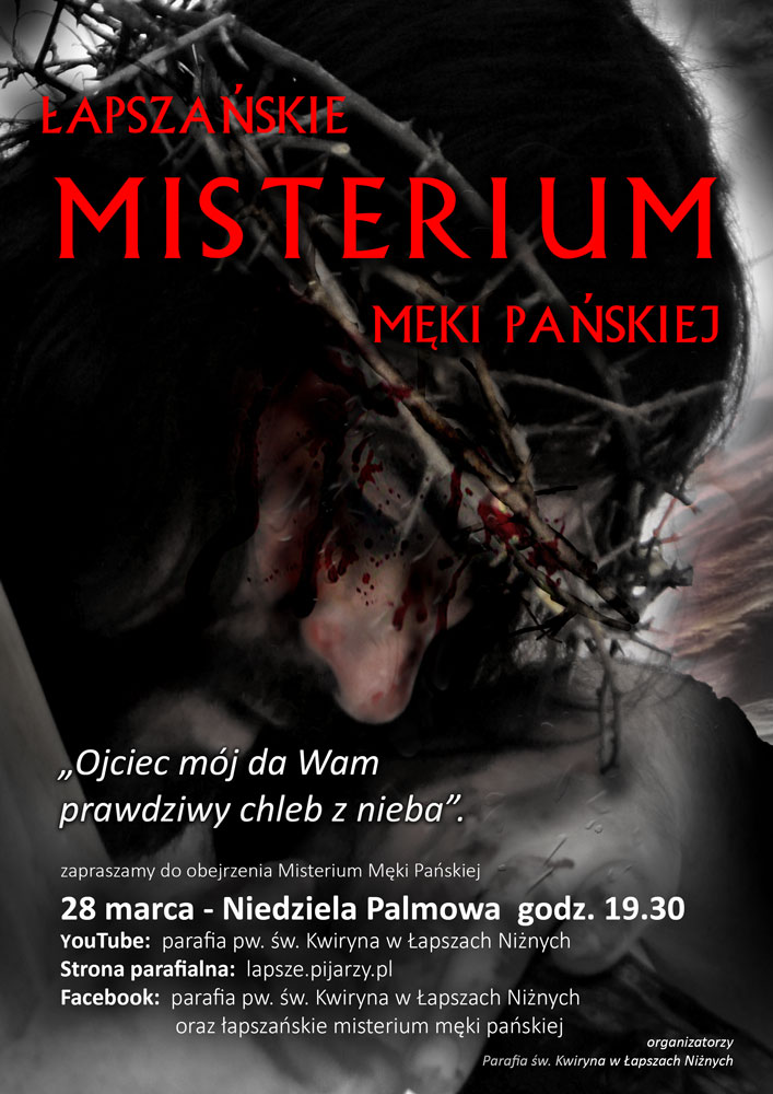 Zapraszamy do obejrzenia i przeżycia jeszcze raz Misterium Męki Pańskiej realizowanego przez społeczność naszej parafii. Tegoroczna inscenizacja odbyła się w formie transmisji on - line w Niedzielę Palmową o godzinie 19. 30 w naszej letniej kaplicy. Całość nagrania prezentujemy w serwisie YouTube.
